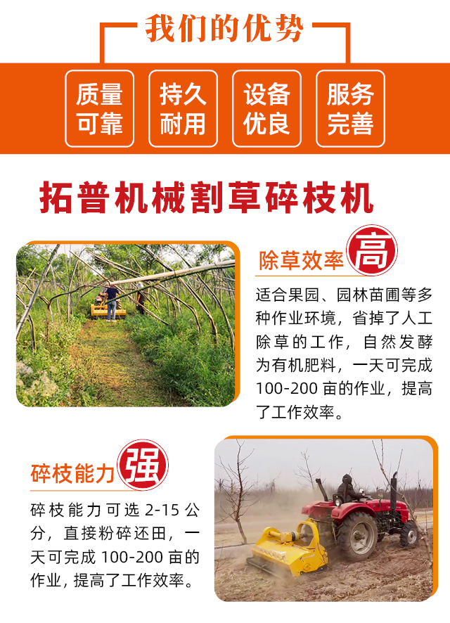 之前树木修剪后的树枝都需要人工搬运,树枝体积大,人工搬运的效率低下。草莓软件视频机械割草碎枝一体机,其碎枝能力可达2-15公分,可直接把树枝粉碎还田,自然发酵为有机肥料,一天可完成100-200亩的作业,提高了工作效率,降低人工成本。