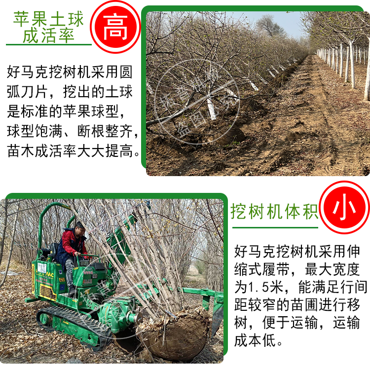 好马克挖树采用伸缩式履带设计,履带可伸缩100-150cm,机身小巧灵活,可在行间距比较窄的地方作业。采用圆弧刀设计,通过更换刀片调整土球的大小,可以挖40-140cm的苹果土球,可以挖花灌木、丛生、分支点的树木以及乔木等各种树种。机器通过高频振动,快速切割实现挖树,断根整齐,土球饱满,树木移栽成活率高。