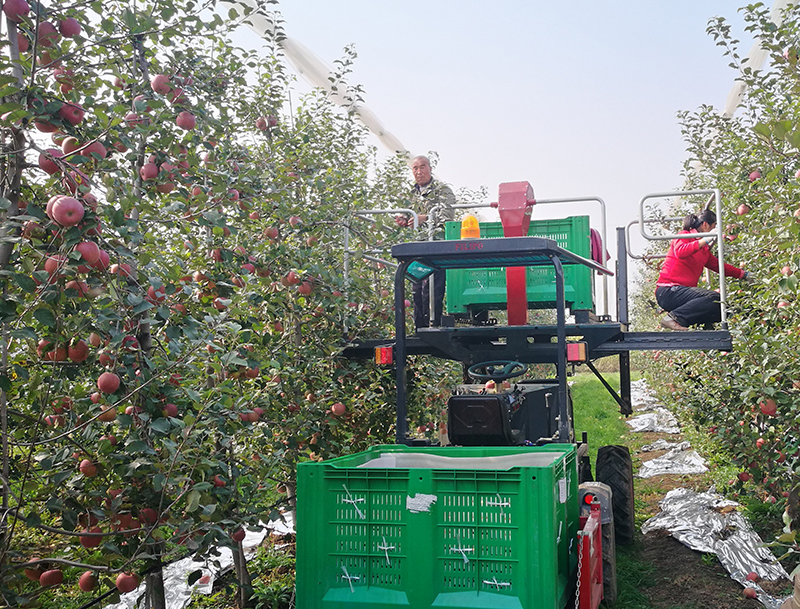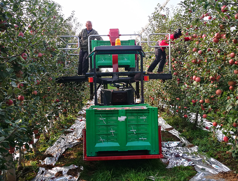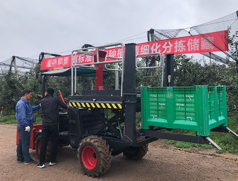 该平台在多功能果园作业平台的基础上进行了产品升级,添加了自卸装置,方便了工作人员的采摘搬运环节,通过自卸装置可直接600斤标准大果筐,进行上下装卸和搬运,并可以直接运送至指定地点,减少果实倒筐作业,提高工作效率和果实的良品率。产品动力也可分为柴油版和电动版两种版本。果园采摘车
