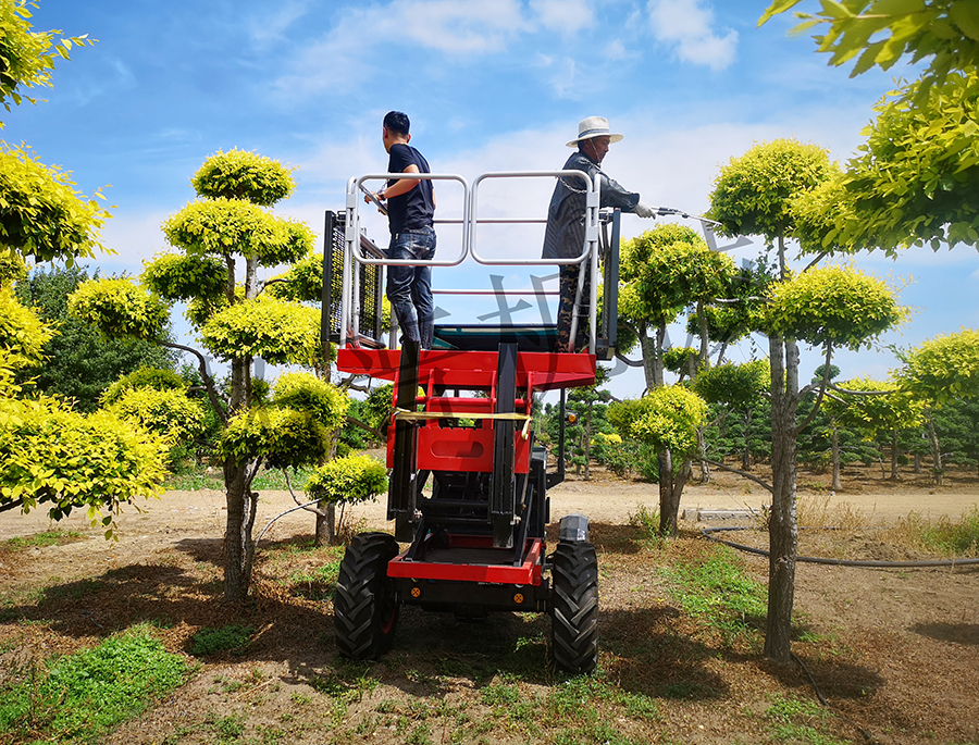 多功能高空作业平台集多种功能于一体,具有一机多用、安全高效等特点。平台动力分为柴油动力和电动动力,柴油版采用原装进口久保田发动机,省油更放心,电动版采用72V150A/时,电池组,动力强劲,经济环保。可自由搭配各种配套装配,可实现高空作业、养护、搬运、运输、吊装、户外发电、户外液压、灌溉打药、高压清洗等功能。园林高空作业车。